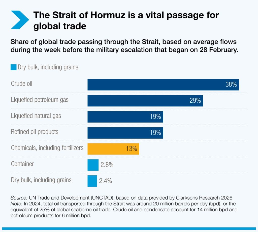 Roughly 38% of crude oil, 29% of liquified petroleum gas and 19% of the world’s supply of oil and liquefied natural gas are transported through the Strait of Hormuz, according to data compiled by Tailwind Futures. Ships transiting through the strait have come to a near halt since the war began on 28 February.