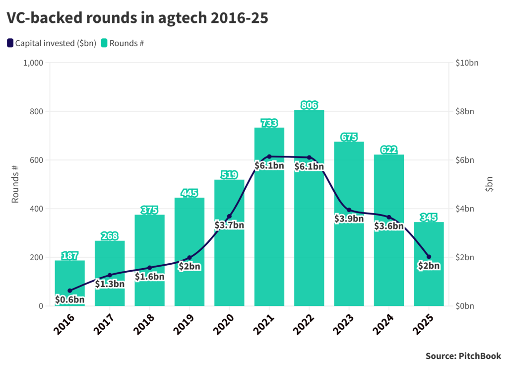 That more grounded approach is also a reflection that some of the more expensive areas of agtech, like indoor farming or meat alternatives, have thinned out. Companies in the sector are no longer closing large series B and C rounds without any route to profit.