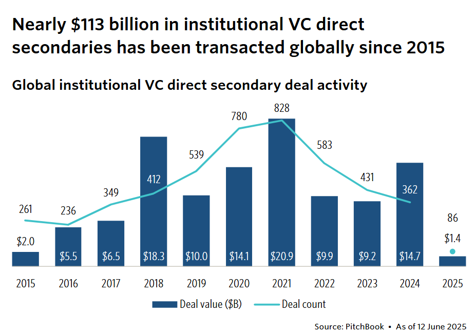 The report, Sizing the Institutional VC Direct Secondaries Market, recorded $14.7bn of activity in direct VC secondary sales in 2024 (numbers for 2025 appear low because data collection methods may lead to a lag).